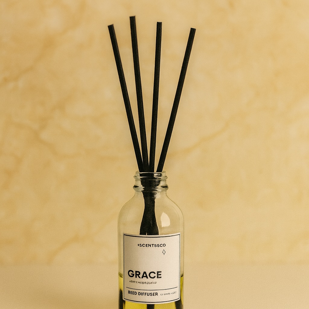 This Reed Diffuser by ISCENTS & CO, features a clear glass bottle filled with golden-yellow fragrance oil, topped with several sleek black reed sticks that disperse scent into the air. In addition, to GRACE scent, ISCENTS & CO offer a variety of signature scents to suit every mood and space, including: